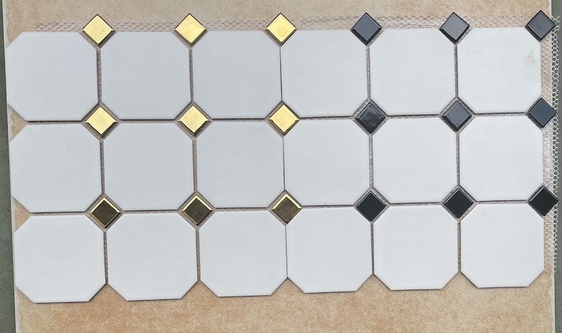 GẠCH MOSAIC BÁT GIÁC Mã số : MHG 808 Màu Sắc : Màu Trắng + viên vàng Loại men : men trơn , mặt mờ Kích thước viên : 95.2mm x 95.2mm + 25 x 25mm Kích thước vỉ: 300mm x 300mm Độ dày : 6mm Quy cách : 1m2 = 11 vĩ Đóng gói : 1 thùng 20 vĩ = 1.82 m2 Cân Nặng : 20 Kg/ Thùng Sử dụng: thường dùng trong trang trí nội ngoại thất nhà bếp, phòng tắm, quầy bar.