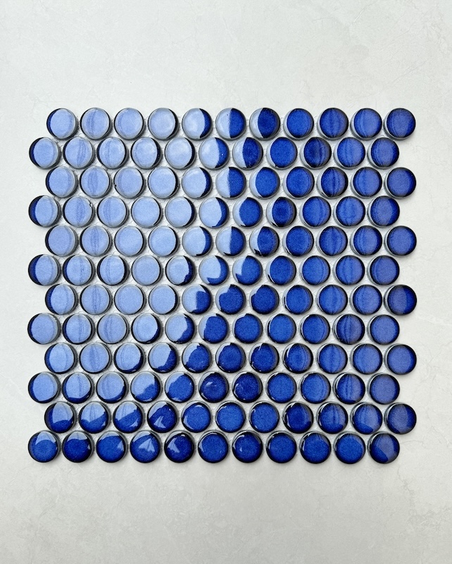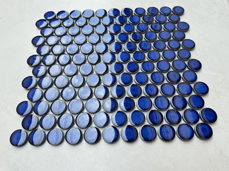 GẠCH MOSAIC CHẤM BI MÀU XANH DƯƠNG Mã số : CB 128 Màu Sắc : Màu xanh dương Loại men : men trơn , mờ Kích thước viên : phi 28 Kích thước vỉ: 330 mm x 312 mm Độ dày : 6mm Quy cách : 10 vĩ = 1,03 m2 Đóng gói : 1 thùng 20 vĩ = 2,059 m2 Cân Nặng : 22 Kg Sử dụng: thường dùng trong trang trí nội ngoại thất nhà bếp, phòng tắm, quầy bar.