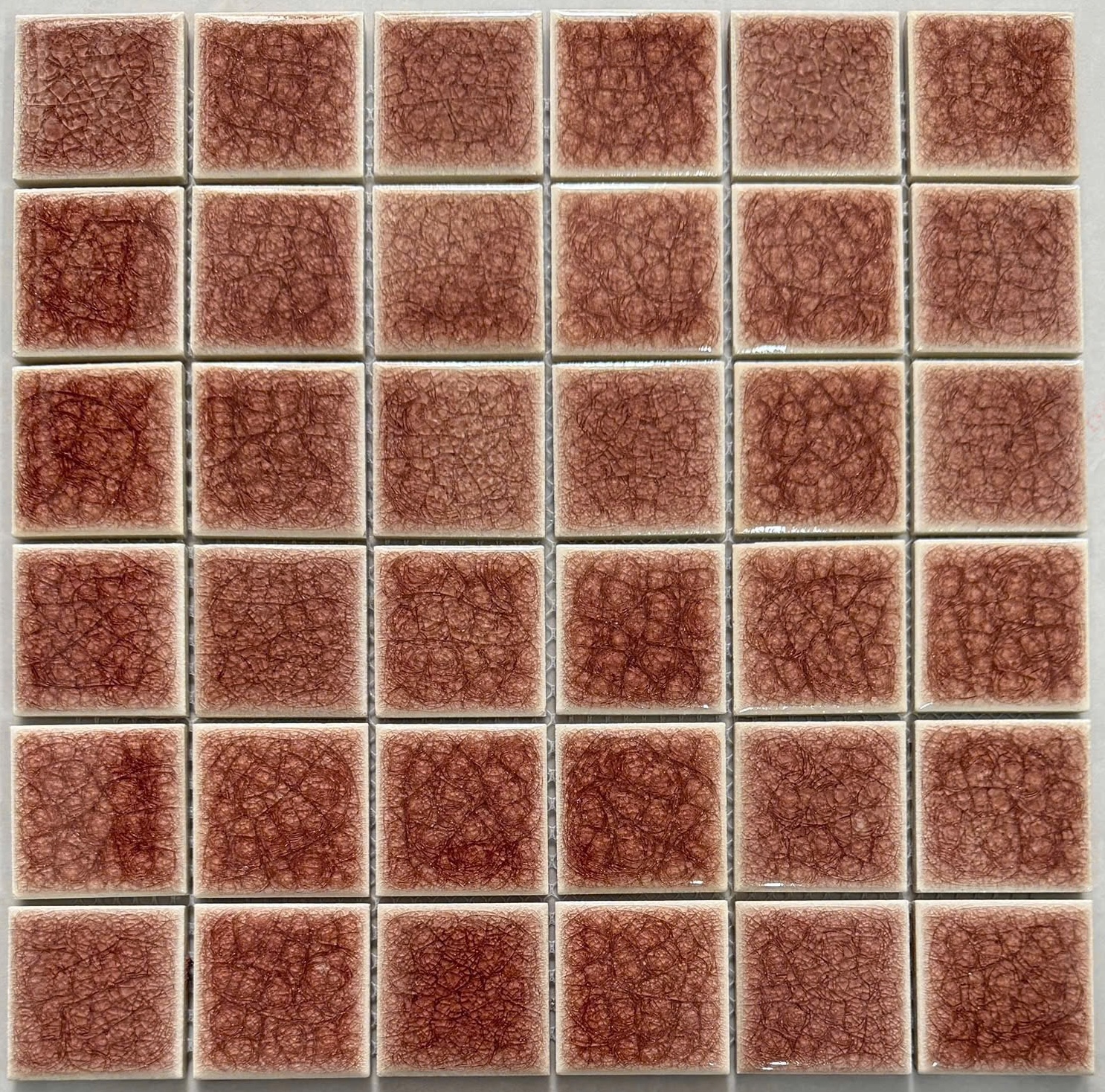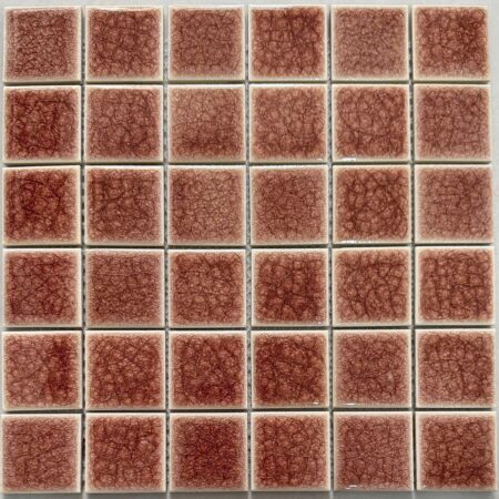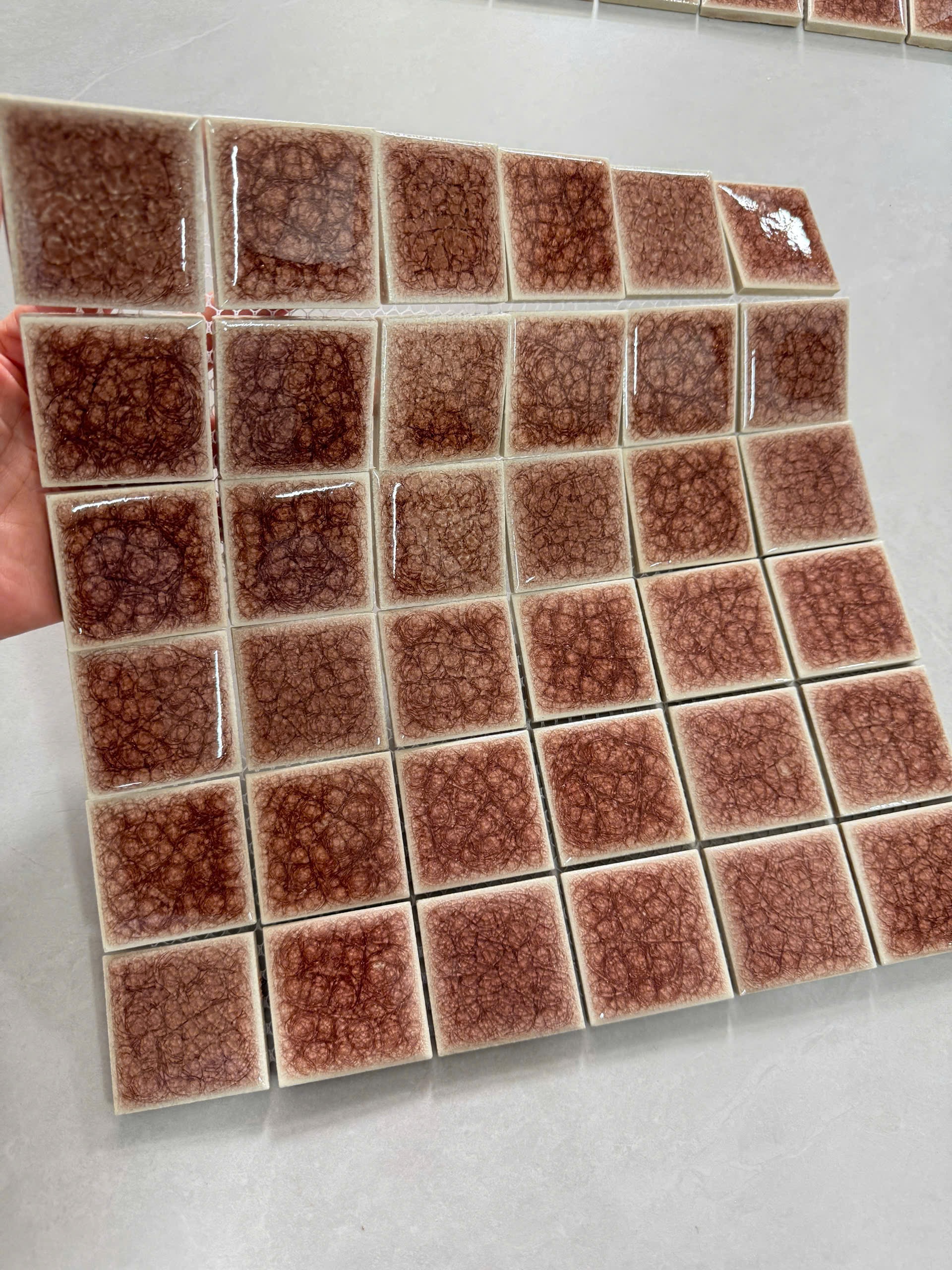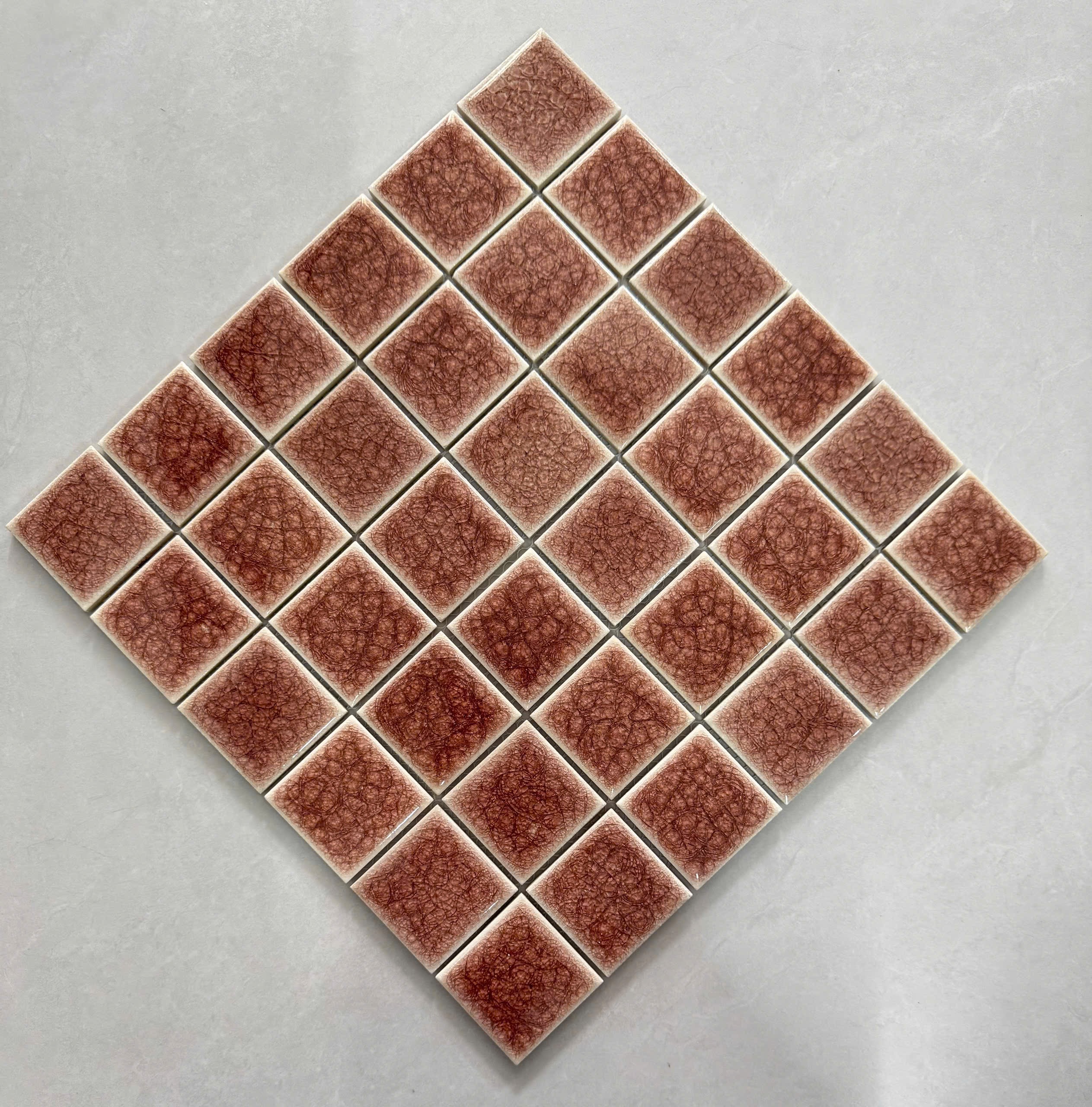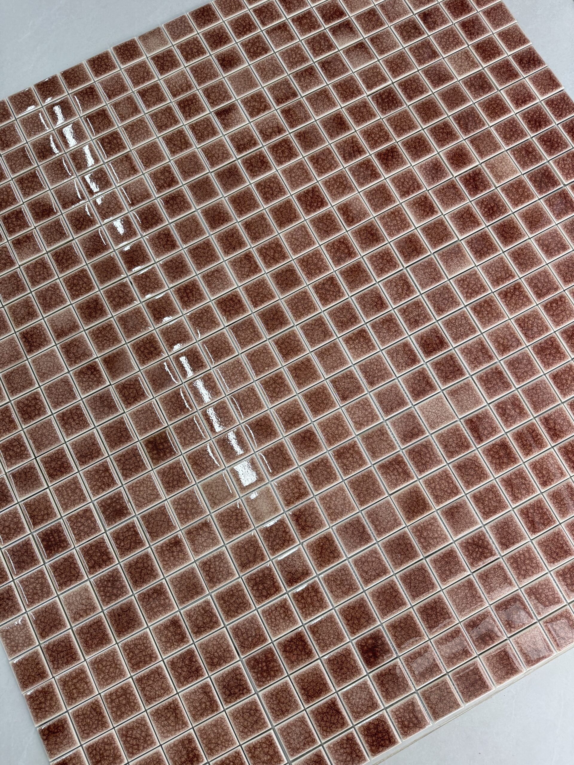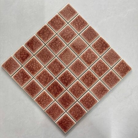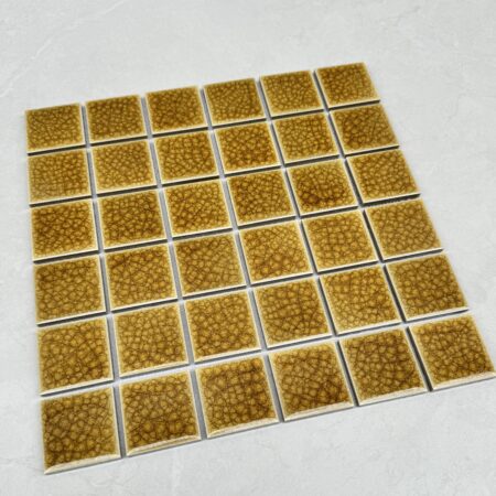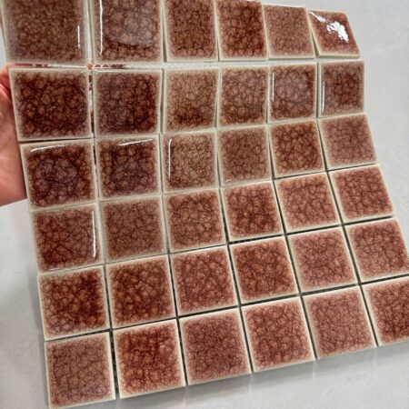 Gạch Mosaic gốm sứ được hình thành từ quá trình nấu chảy ở nhiệt độ 800 – 1300 độ C, sau đó lại được xử lý rồi cán ra thành từng viên nhỏ với kích cỡ mỗi viên có cạnh từ 2-10cm.