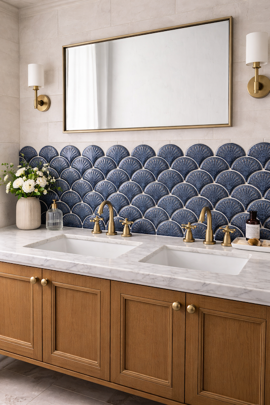 Gạch mosaic vảy cá có thiết kế độc đáo, giúp tạo điểm nhấn ấn tượng cho không gian ứng dụng. Bạn có thể sử dụng gạch vảy cá ốp bếp, phòng tắm, trang trí phòng khách, phòng ngủ