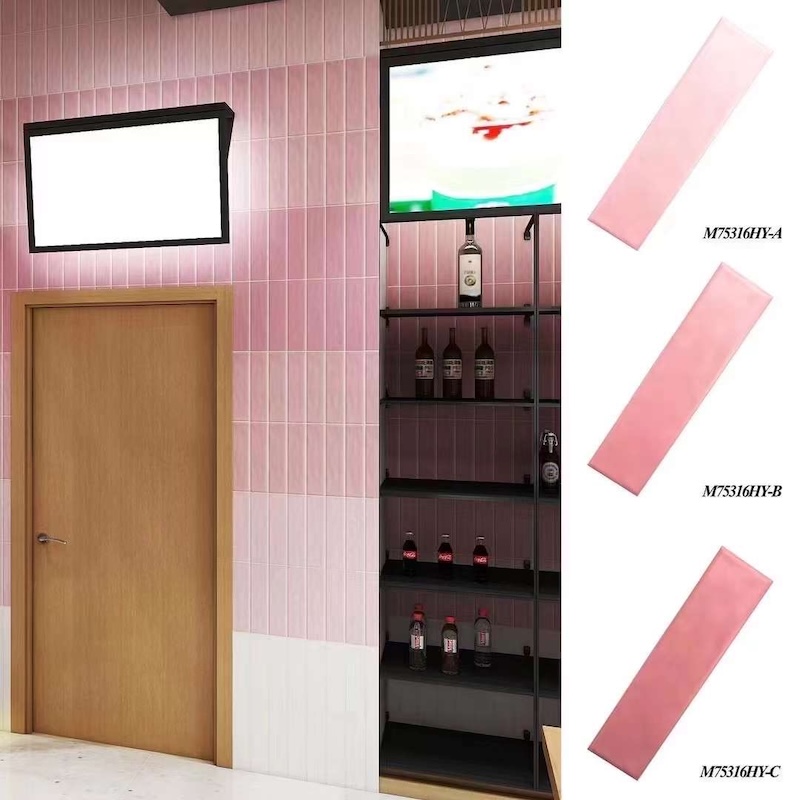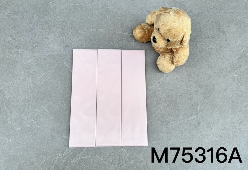 GẠCH THẺ 75316A Chất liệu : gốm sứ phủ men Màu Sắc : Màu hồng , dạng thẻ mặt gợn sóng, mờ Kích Thước : 75mm x 300mm Độ Dày : 7.5mm Quy Cách : 1 thùng 50 viên = 1.125 m2 Cân Nặng : 16 Kg Thích hợp ốp tường phòng khách, phòng ăn, nhà bếp, phòng ngủ, đại sảnh, phòng tắm, nhà vệ sinh, nhà tắm